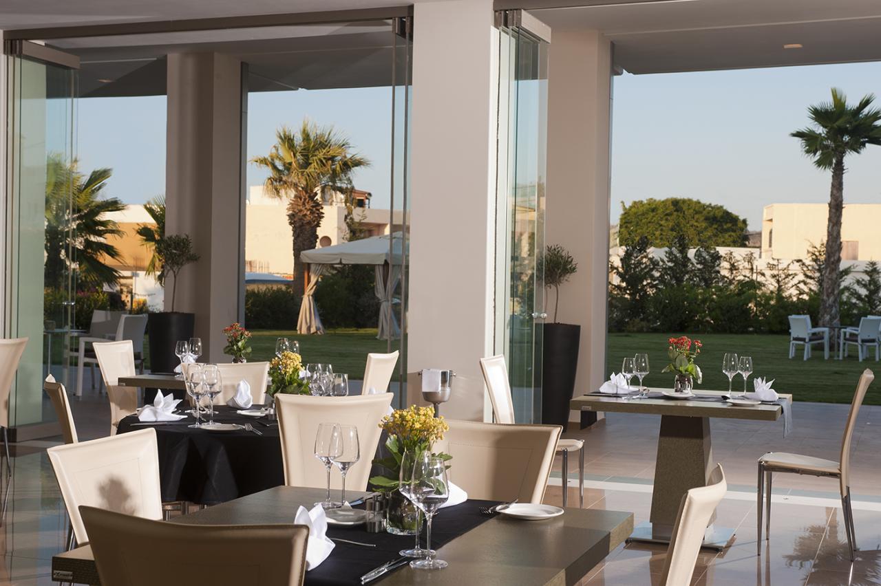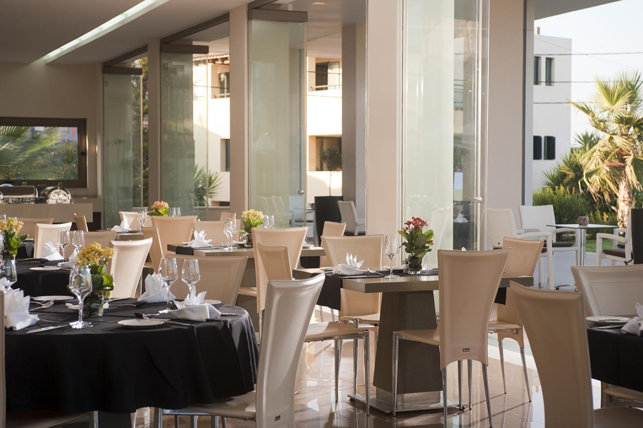 Félpanziós (reggeli és vacsora italok nélkül) - és teljes panziós (reggeli, ebéd és vacsora italok nélkül) ellátással foglalható. Ínyenc krétai és a világ minden tájáról származó fogásokat tálalnak fel az Elea étteremben, ahonnan panorámás kilátás nyílik a hegyekre. A vendégeket érkezéskor sherry vagy délutáni tea várja.